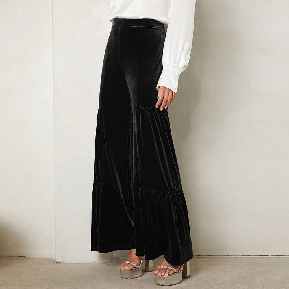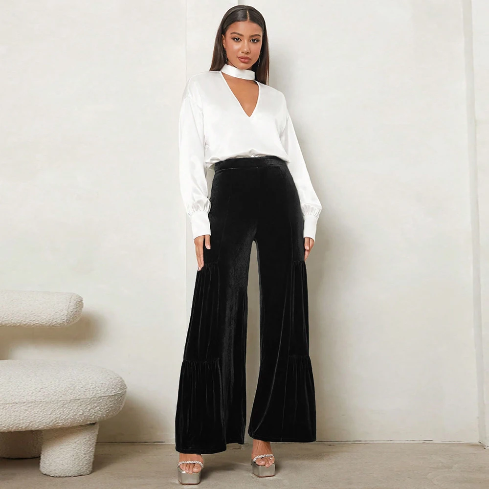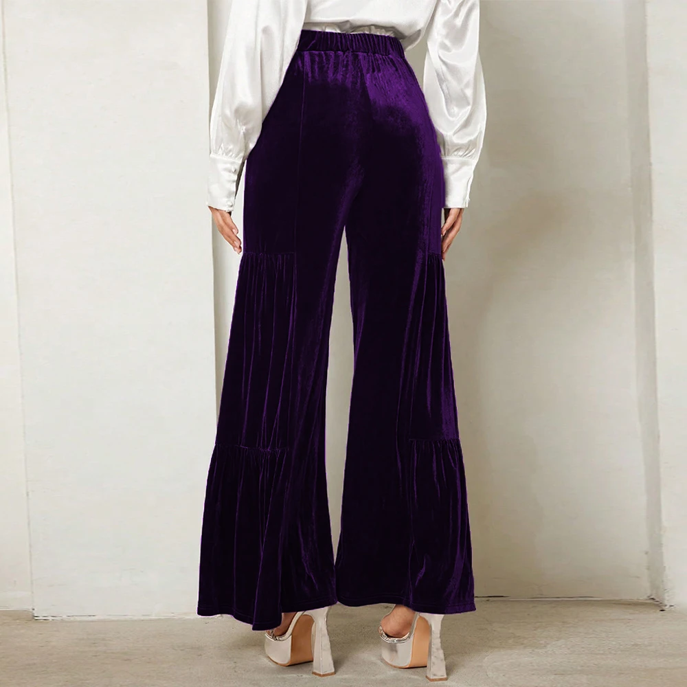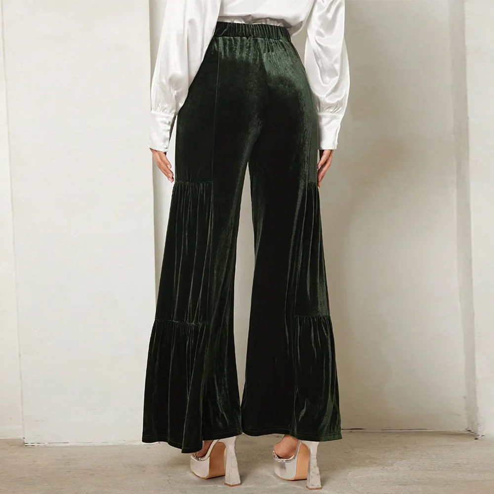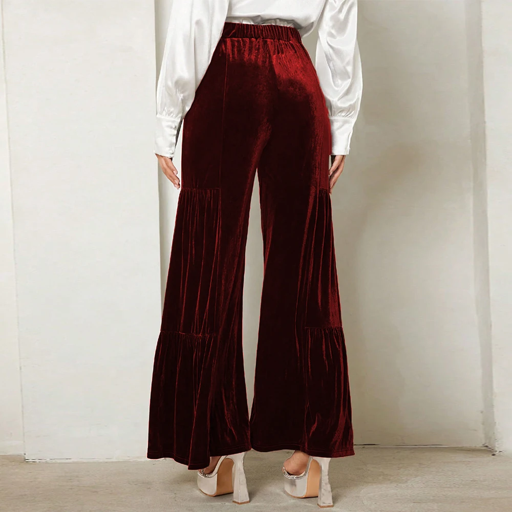 Women's autumn and winter gold velvet wide-leg pants with ruffles, high waist, straight, loose and slim elegant trousers